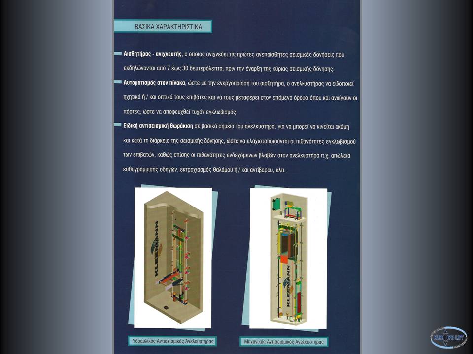 Ειδική κατασκευή που «αντιλαμβάνεται» τον σεισμό πριν συμβεί. Σε μεταλλικό φρεάτιο που με την χρήση συστήματος απεγκλωβισμού ολοκληρώνει την προεπιλεγμένη διαδρομή χωρίς να επιτρέπει την περαιτέρω χρήση του σε περίπτωση σεισμού ή ακόμη και πυρκαγιάς.